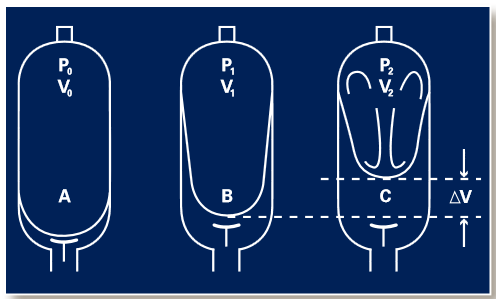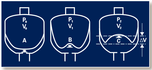 C - Vị trí ở áp suất vận hành tối đa: sự thay đổi thể tích Δ V giữa vị trí tối thiểu và tối đa của áp suất vận hành thể hiện lượng chất lỏng được lưu trữ.