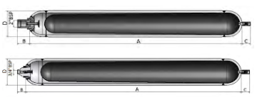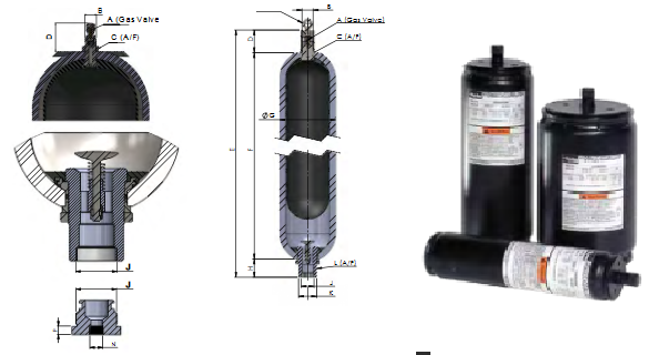 A – Bao cao su (túi chứa khí) ở vị trí biến đổi trên, có nghĩa là bình tích chỉ chứa nitơ trong túi. Hệ thống chống đùn đóng cửa lỗ thủy lực ngăn chặn sự phá hủy của túi khí. Trong tui nạp với áp suất thấp, túi khí dựa vào thành bình. Chênh lệch áp suất tối đa (P2 / P0): 4: 1