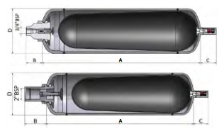 A – Bao cao su (túi chứa khí) ở vị trí biến đổi trên, có nghĩa là bình tích chỉ chứa nitơ trong túi. Hệ thống chống đùn đóng cửa lỗ thủy lực ngăn chặn sự phá hủy của túi khí. Trong tui nạp với áp suất thấp, túi khí dựa vào thành bình. Chênh lệch áp suất tối đa (P2 / P0): 4: 1