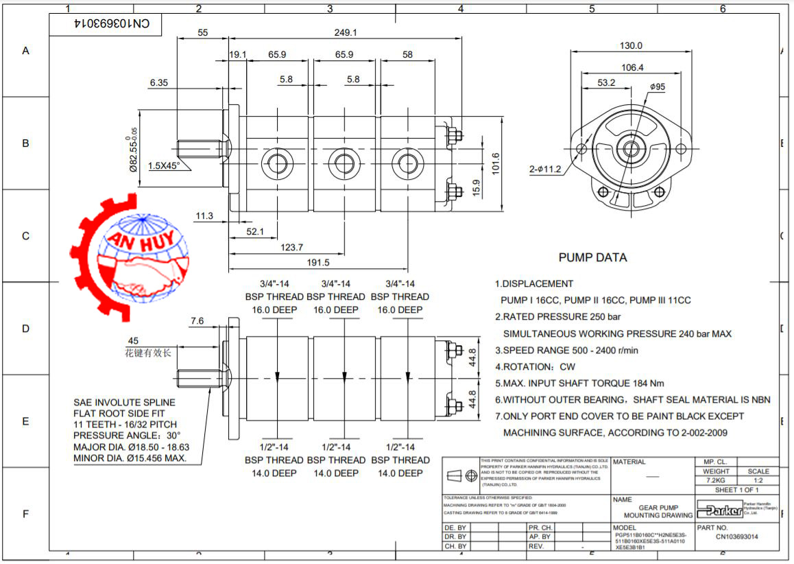 Bơm bánh răng 3 tầng Parker CN103693014 dùng cho các loại máy xúc nhỏ, máy xúc mini như PC20, PC30, ZZX40, PC20U, PC30U, PC50U, SV08, MS01, MS02, DX55W,... dùng phổ biến trên thị trường hiện nay đều có mặt tại Thủy lực An Huy.