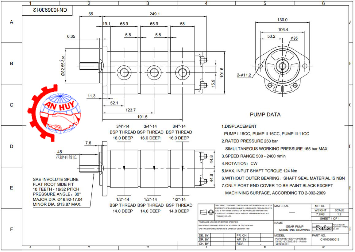 Bơm bánh răng 3 tầng Parker CN103693012 có kết cấu vỏ nhôm nguyên khối bền chắc với trục 10 then dài 45mm.