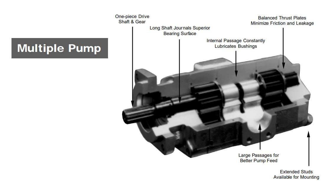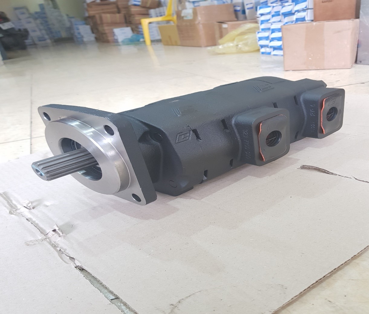 Đây là loại bơm bánh răng hai tầng với 2 khoang bánh răng cung cấp các áp suất khác nhau,linh hoạt cung cấp áp suất cho các hoạt động khác nhau của xe cẩu.