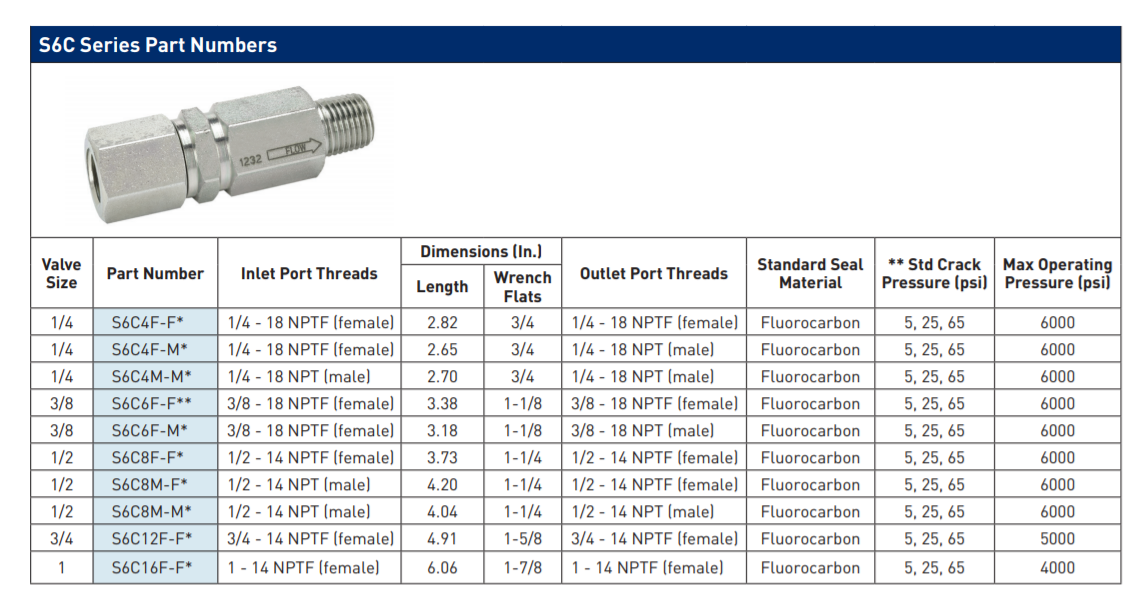Van một chiều S6C là thép không gỉ với áp suất định mức là 6000 psi (kích thước 1/4”, 3/8”, 1/2”, 3/4” & 1”)