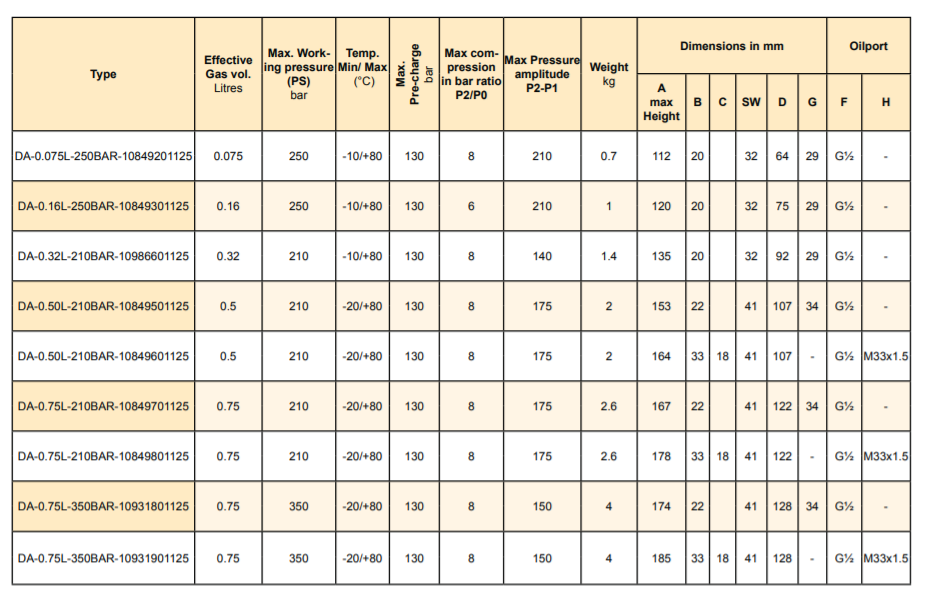 Thông số kĩ thuật Bình tích áp DA-0.75L-210BAR - ELM 0.75-210/85/A /Part 10984701125
