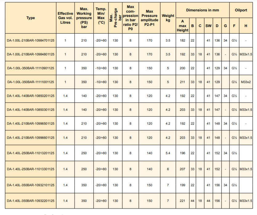 Thông số kĩ thuật Bình tích áp DA-1.40L-210BAR - ELM 1.4-210/88/AF/ Part 10996501125