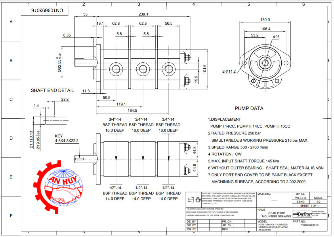Bơm bánh răng 3 tầng CN103693016 sản xuất theo tiêu chuẩn Parker - USA. Nhà phân phối Thủy lực An Huy cung cấp chính hãng các sản phẩm của hãng tại Việt Nam. Cam kết bảo hành theo chế độ bảo hành của hãng. Khách hàng có nhu cầu mua liên hệ hotline 0977282045 để được tư vấn đặt hành.