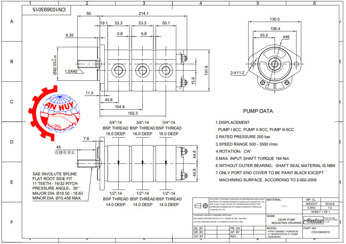 Bơm bánh răng 3 tầng Parker PGP511 có kết cấu vỏ nhôm nguyên khối bền chắc có loại trục 11 then dài 45mm.