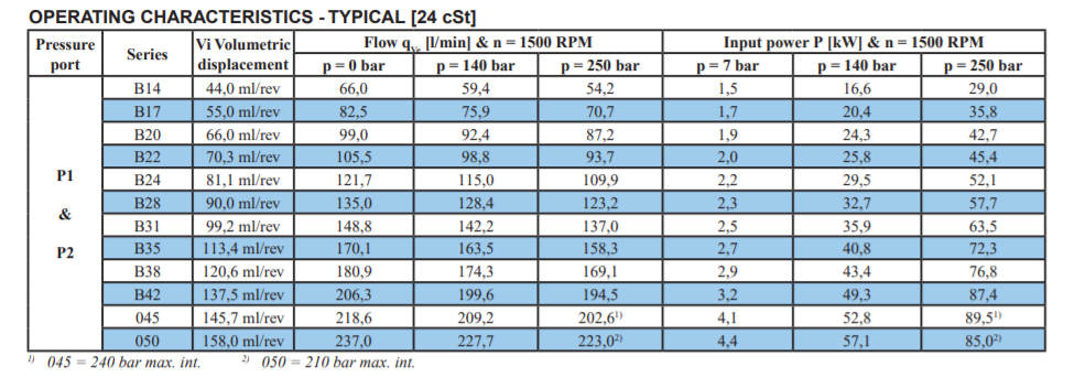 Bảng thông số lưu lượng áp suất Bơm cánh gạt T7DDS E38 E24 1R01 A1M0
