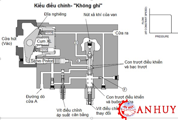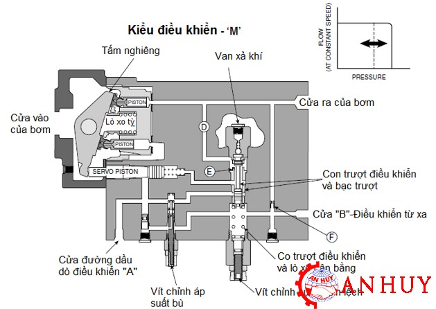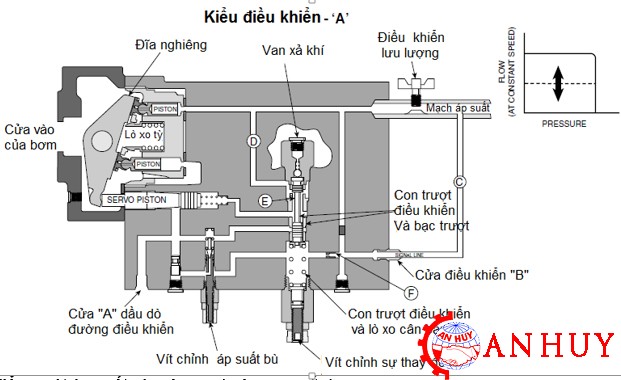 Lưu lượng được điều chỉnh được thực hiện bằng cách đặt một lỗ (cố định hoặc Điều chỉnh) trong cửa ra của bơm. Độ chênh áp suất (∆P) trong điều khiển lưu lượng này là tín hiệu điều khiển lưu lượng cửa ra của bơm. Kiểm soát sản lượng của bơm, như được giải thích dưới đây. Bất cứ khi áp suất giảm tại điều khiển dòng chảy tăng lên (Chỉ ra sự gia tăng lưu lượng đầu ra), những nỗ lực của bơm Để bù đắp bằng cách giảm lưu lượng đầu ra. Nó làm điều này Bằng cách cảm nhận áp suất thấp hơn ở phía hạ lưu của Kiểm soát dòng chảy qua đường (C), được cân bằng Áp suất bơm qua đoạn (D), trên ống điều khiển. Thanh trượt điều khiển bị đẩy xuống điều khiển con trượt bằng lo xo do áp suất chênh lệch. Điều này cho phép Servo piston khoang, bơm xả đến điểm Áp suất áp đặt qua lỗ được duy trì Và dòng chảy được thu được. Các cuộc trò chuyện này cũng đúng bất cứ khi nào áp lực Giảm giảm (chỉ ra sự giảm lưu lượng đầu ra). Trong Trường hợp này, thanh điều khiển được buộc lên. Điều này tăng lên Bơm dời trong một cố gắng để duy trì Áp suất giảm hoặc dòng chảy liên tục. Cần lưu ý rằng bơm vẫn còn áp lực Bù đắp và làm thay đổi áp suất được lựa chọn cài đặt. Việc điều khiển bù áp sẽ ghi đè Kiểm soát dòng chảy bất cứ khi nào của bộ bù áp. Thiết lập kiểm soát được đạt tới. Áp suất thấp áp Sự sắp xếp này cũng có thể được sử dụng để cung cấp áp suất thấp Chế độ chờ bằng cách thông hơi qua cổng "B" thông qua một nút bật / tắt đơn giản Van thích hợp cho dòng chảy 3,8-7,6 LPM (1-2 GPM). Khi nào Dòng chảy hoặc áp suất là cần thiết, van này được đóng cho phép Áp lực hệ thống để xây dựng phía sau ống điều khiển và Đưa bơm lên. Cảm biến tải Nếu, thay vì đo áp lực giảm trên Lỗ tại cổng ra của bơm, nó được đo ở hạ lưu Của một van điều khiển hướng, sự giảm áp suất liên tục Sẽ được duy trì trên ống van. Kết quả này trong Dòng chảy liên tục cho bất kỳ lần mở nào của hướng Van điều khiển không phụ thuộc vào công việc hạ lưu hoặc Tốc độ vận hành của bơm. Máy bơm "cảm nhận" lượng áp lực cần thiết để Di chuyển tải và điều chỉnh lưu lượng đầu ra phù hợp với van Mở được lựa chọn và áp lực để vượt qua tải Cộng với giá trị đặt trước P trên ống van. Những lợi ích của sự sắp xếp này là tuyệt vời, Đặc tính dòng chảy lặp lại được đạt được, và Tiết kiệm năng lượng đáng kể được thực hiện trong khi đo sáng, So với việc sử dụng một áp lực thẳng bù Hệ thống.