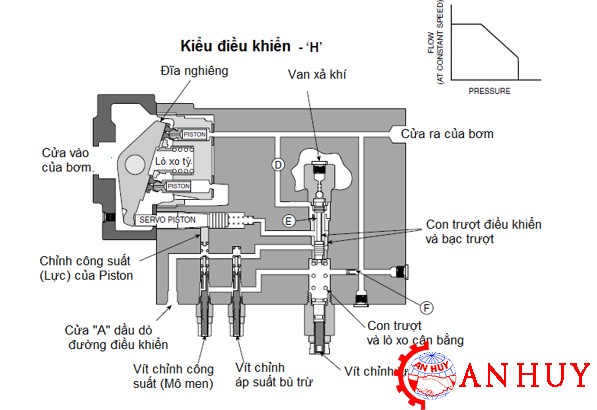 Điều khiển bù áp lực, điều này cho phép kiểm soát Ống đẩy để di chuyển xuống, thoát ra khoang servo piston Và làm cho servo piston di chuyển sang phải. Điều này Làm giảm lưu lượng đầu ra và do đó công suât điện cũng giảm.