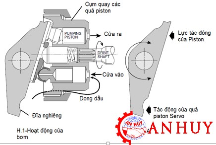Bơm Piston Parker phụ thuộc vào chiều dài hành trình của quả piston bơm. Chiều dài này của hành trình trong việc nghiêng đĩa, được xác định bởi vị trí của đĩa quay Lưu lượng tối đa đạt được ở góc nghiêng đĩa 17 °.Các piston trong cụm xi lanh luân phiên nhau,và được điều khiển quay bơm bởi các động cơ chính,Di chuyển các piston theo đường tròn và piston Dép được hỗ trợ thủy tĩnh chống lại mặt Tấm đĩa. Khi tấm đĩa nằm dọc Vị trí, vuông góc với đường tâm của piston Thùng, không có hanh trình piston và do đó không có Dịch chuyển. Khi tấm đĩa được định vị Ở một góc, các piston được buộc vào và ra khỏi thùng Và dịch chuyển chất lỏng diễn ra. Góc càng lớn Của tấm đĩa, hành trình piston lớn hơn.
